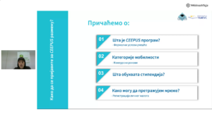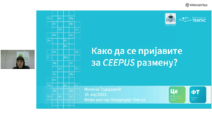 After the approved applications for the 2023/’24 school year and the creation of final traffic sheets, the application process for the implementation of given scholarships begins. It is an opportunity for the National CEEPUS Offices to help applicants, local and network coordinators to follow the application procedures as easily as possible. Today, Info centre of the Temus Foundation and the Serbian National CEEPUS Office organized a webinar entitled “How to apply for the CEEPUS exchange”. Ms. Milena Todorović provided basic information and answered the participants’ questions.